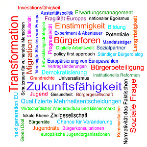 Somit gab die Auftaktkonferenz vor allem auch eine Übersicht über zahlreiche Ansätze and Anlässe für die weitere Diskussion der Zukunft Europas, welche in der beistehenden Wortwolke gesammelt und dargestellt wurden. Die Europa-Union NRW plant, diese Impulse aufzunehmen und in weiteren Veranstaltungen in Kooperation mit ihren Kreisverbänden dann die verschiedenen thematischen Schwerpunkte näher zu betrachten.